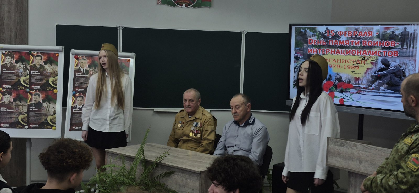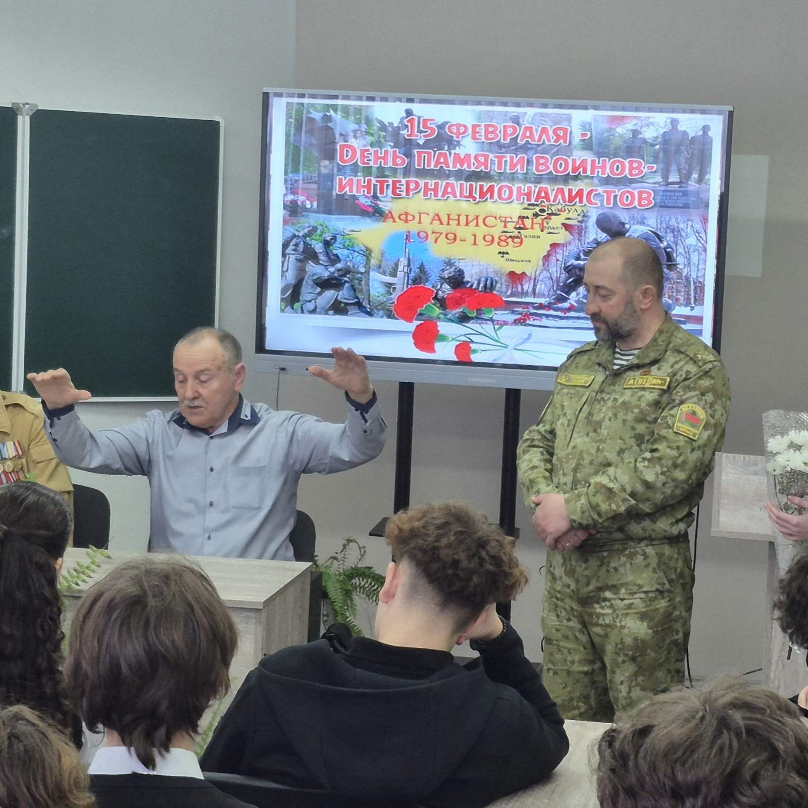 12 февраля накануне значимой даты - Дня памяти воинов-интернационалистов, для учащихся 9 классов состоялась встреча с воинами-интернационалистами: Мацукевичем Василием Степановичем и Зуевым Игорем Васильевичем. Разговор прошел познавательно и душевно, приглашенные поделились своими воспоминаниями о суровых днях своей службы, о долге перед Родиной и патриотизме. В завершении встречи прозвучала песня в исполнении учащихся.