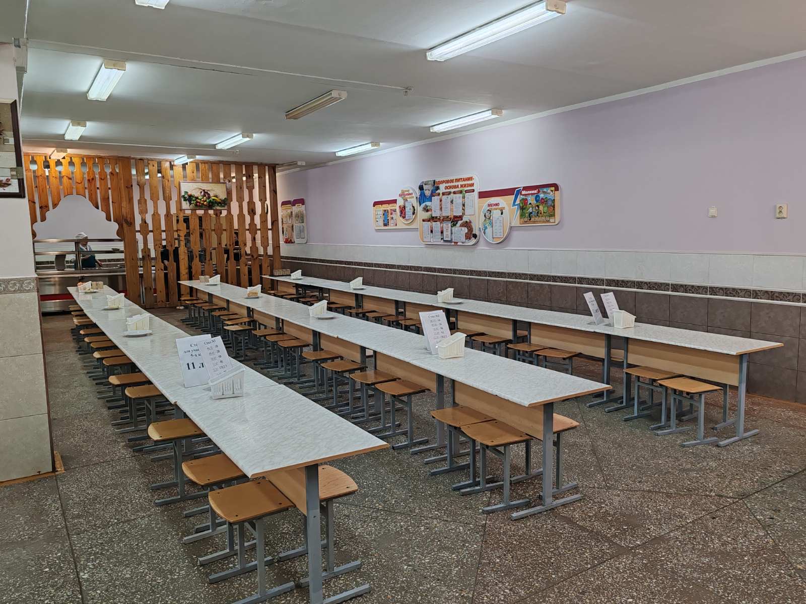 Оформление интерьера обеденного зала столовой |